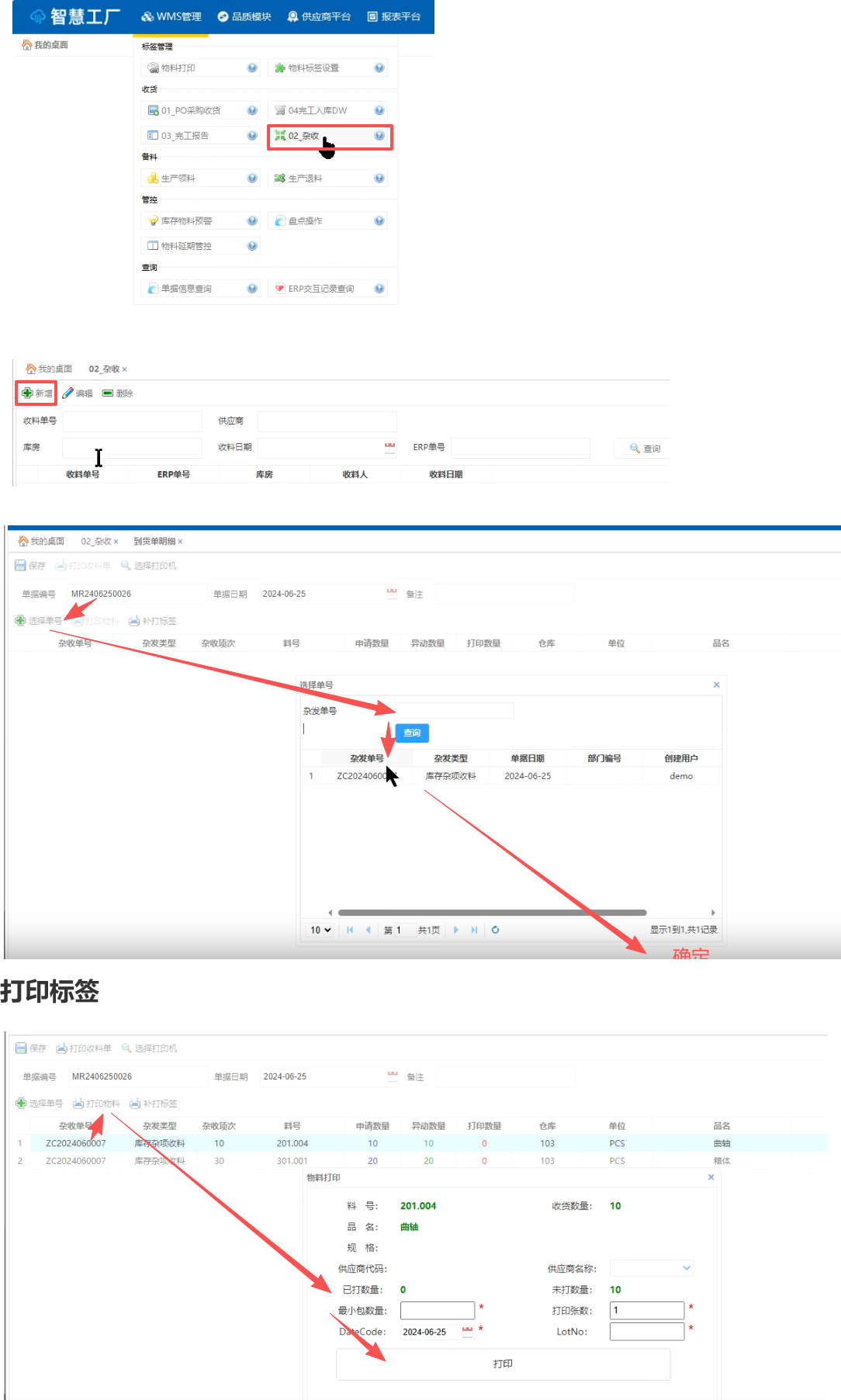 杂收流程 ERP单据是核准中状态 ERP打印的 杂发单和 WMS打印的标签一起交给仓管扫码入库 PDA入库操作选择单据和扫描标签核对入库提交成功 杂收打印标签和扫码入库.mp4附件杂收打印标签和扫码入库.mp4作者:潘茂盛 创建时间:2024-06-25 16:42最后编辑:潘茂盛 更新时间:2025-09-24 23:25